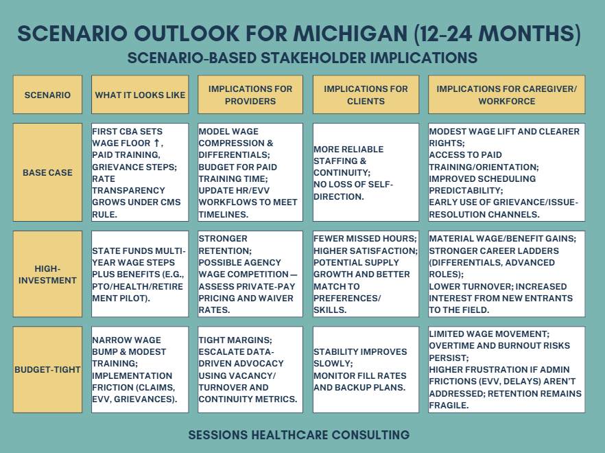 Michigan just crossed an inflection point: nearly 32,000 Home Help direct care workers voted to unionize under SEIU Healthcare Michigan, launching a first contract process that will intersect with CMS’s Ensuring Access rule and the state’s existing self-direction model. For agencies, health tech teams, and care leaders, this is not a narrow labor story—it’s a system story about workforce stability, wage floors, paid training, documentation discipline (EVV, payroll timeliness), and rate transparency. For clients and families, choice and control remain central while the state and union negotiate high-level terms intended to reduce turnover and missed hours. This two-page brief distills what changes now, what to watch over the next 12–24 months, and how to position your organization—whether you operate in Michigan or are tracking the ripple effects in other states considering similar structures.